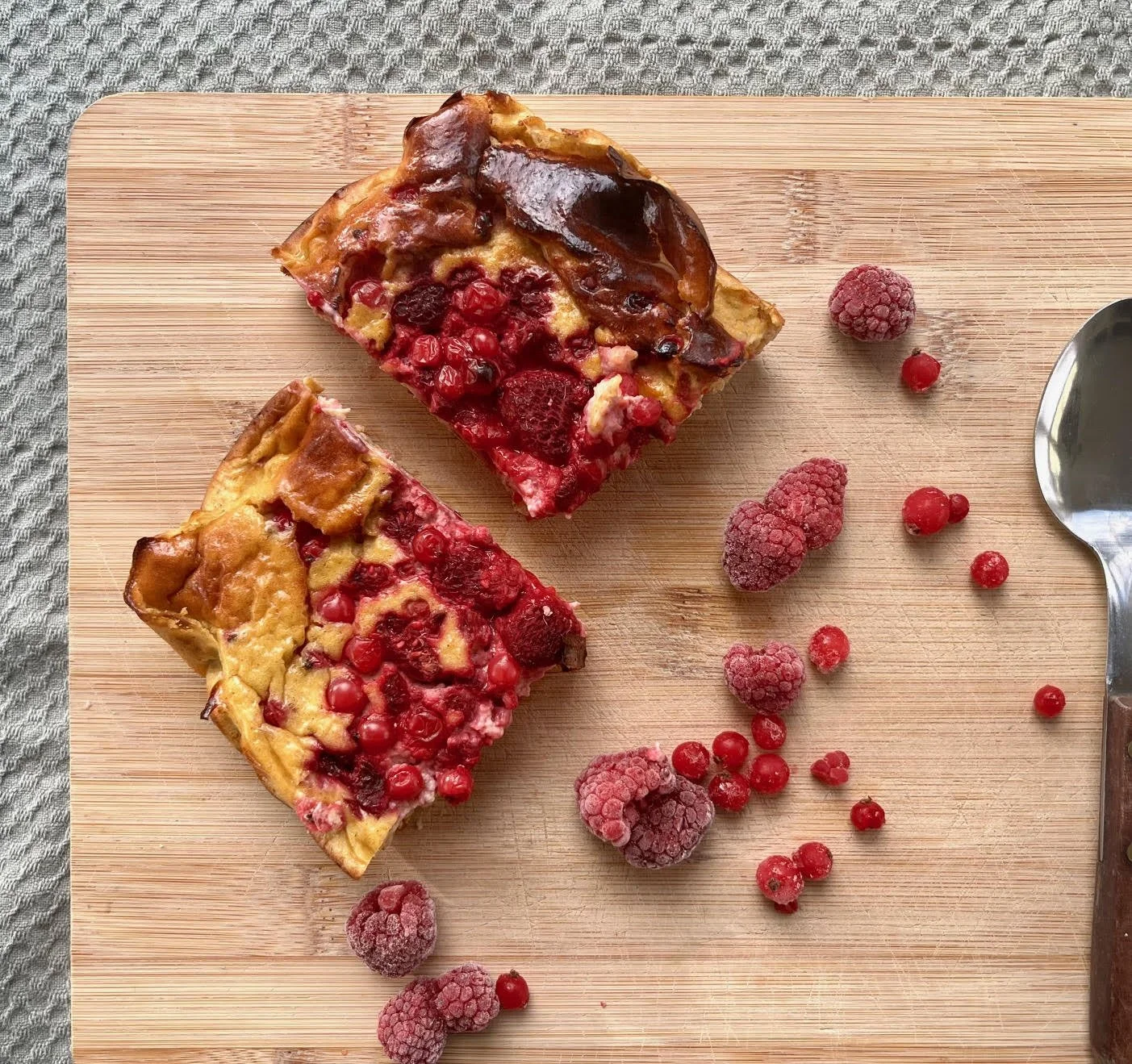 Giet het beslag in de ovenschaal en verdeel het bevroren fruit over de bovenkant. Daarna bak je het geheel